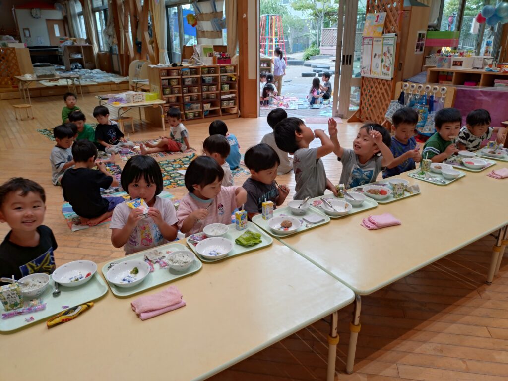 配膳台に向かって横に一列に並んで食べていました‼😲