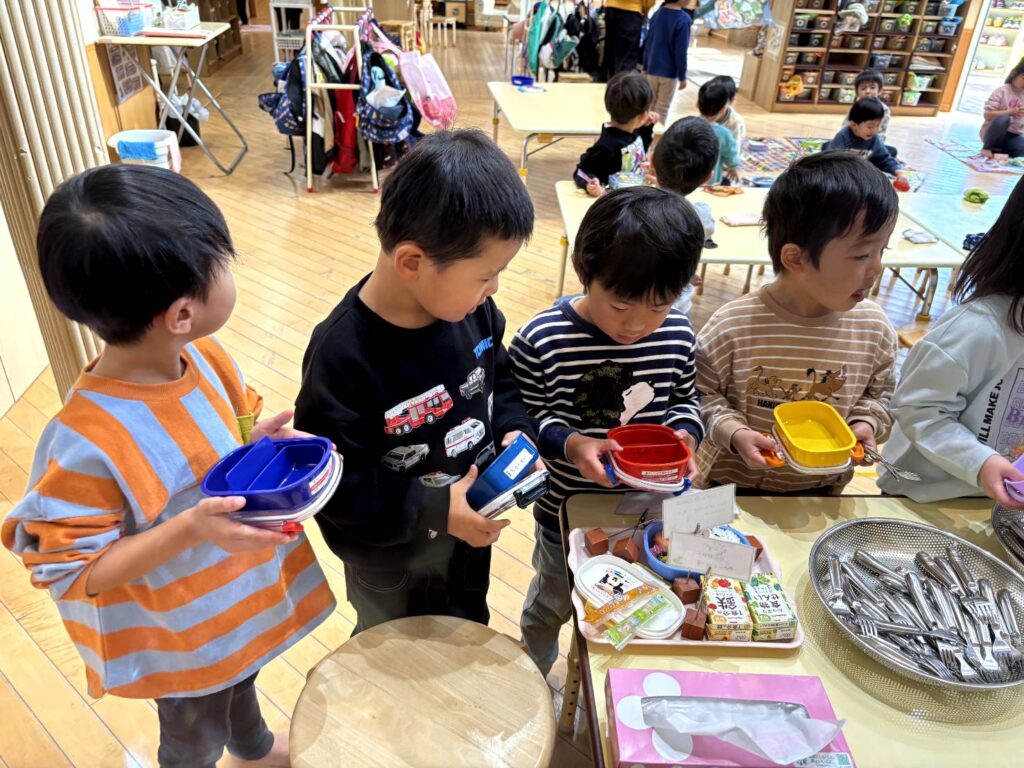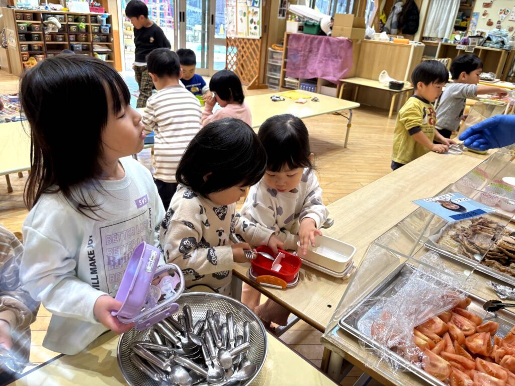 いよいよ、給食を詰めてもらいます🎵