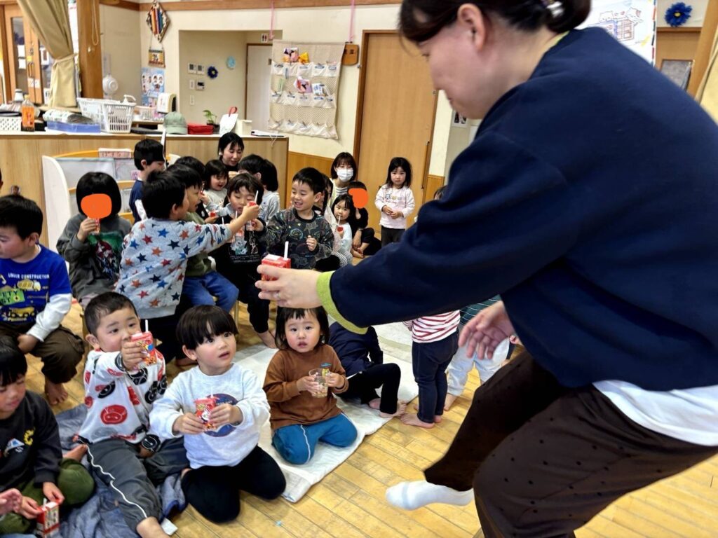 新しい園長先生からジュースをもらい、みんなで「かんぱ~い🍹」